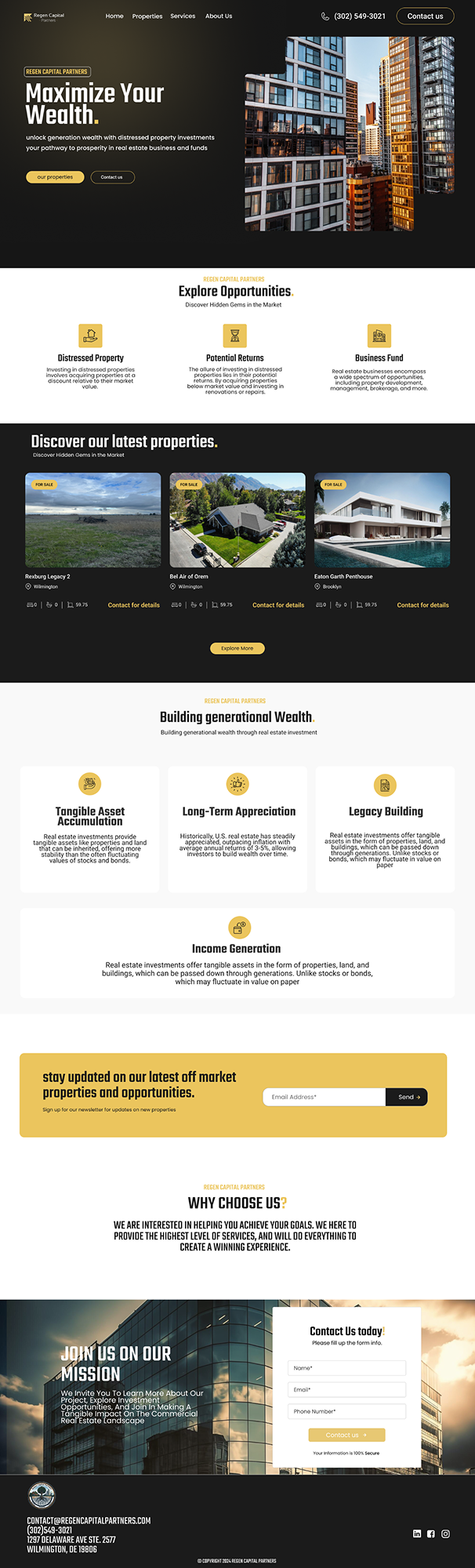 Regen Capital Partners specializes in helping clients build generational wealth through distressed property investments and business funding. They needed a professional website to showcase opportunities, explain their investment model, and drive engagement.