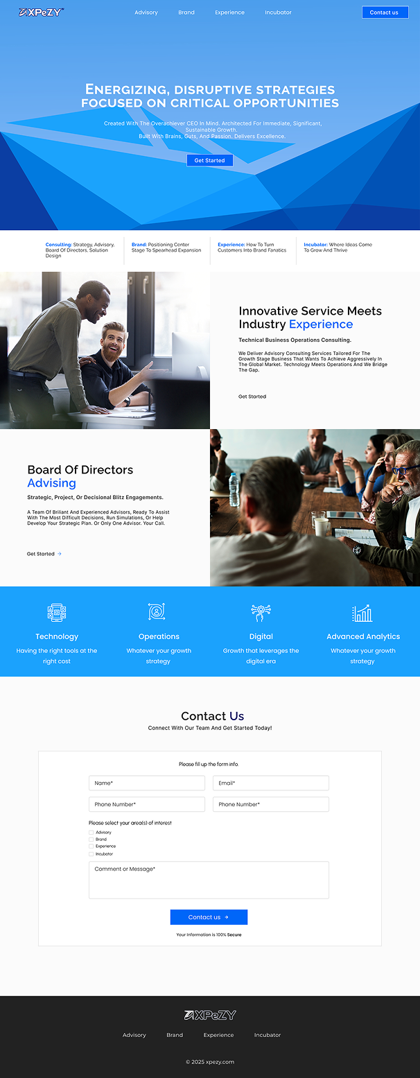 Xpezy is a consulting and innovation platform offering strategic services for business growth, brand positioning, and technical operations. They needed a bold, modern website to communicate their disruptive approach and attract high-level executives.