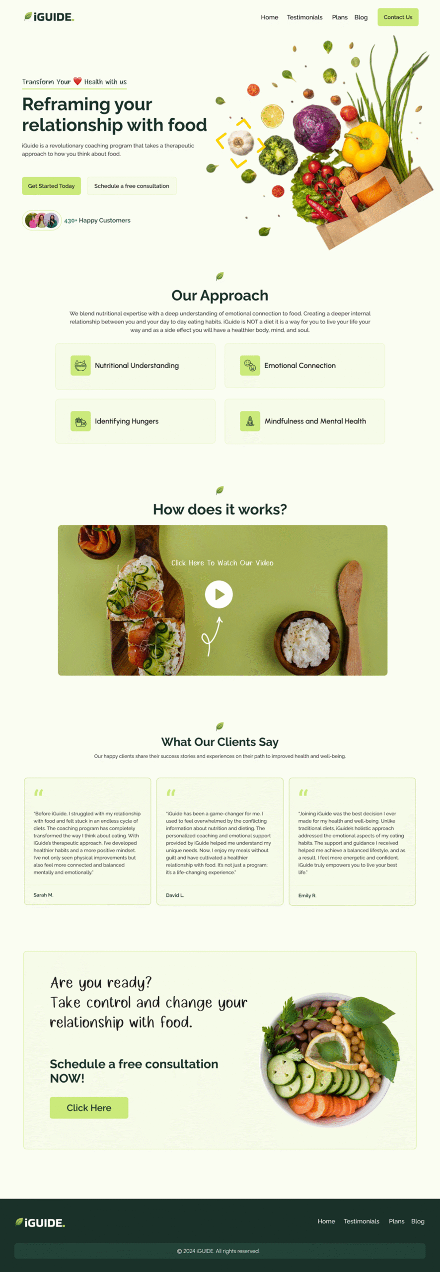 iGuide offers a therapeutic coaching program focused on helping individuals build a healthier relationship with food. They needed a visually engaging website that clearly communicated their approach and encouraged visitors to take action.