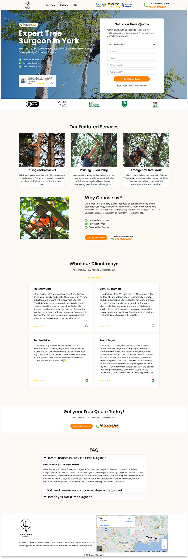 Trident Tree Works offers professional tree removal, trimming, and maintenance services. They needed a high-converting landing page to generate leads and clearly showcase their services to local homeowners.